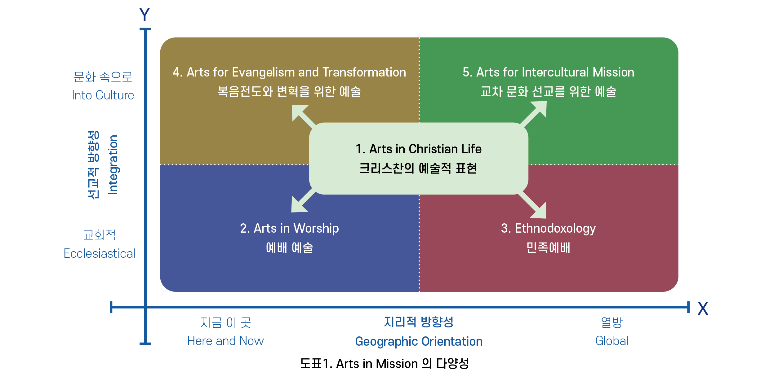 우리는 이상의 정의에 의하여 예술이 선교 안에서 다양한 모습으로 표현될 수 있음을 표 1에 정리하였습니다. 먼저 선교의 “지리적 방향성”을 X 축에, 선교의 “선교적 통합성”을 Y 축에 배열했습니다.