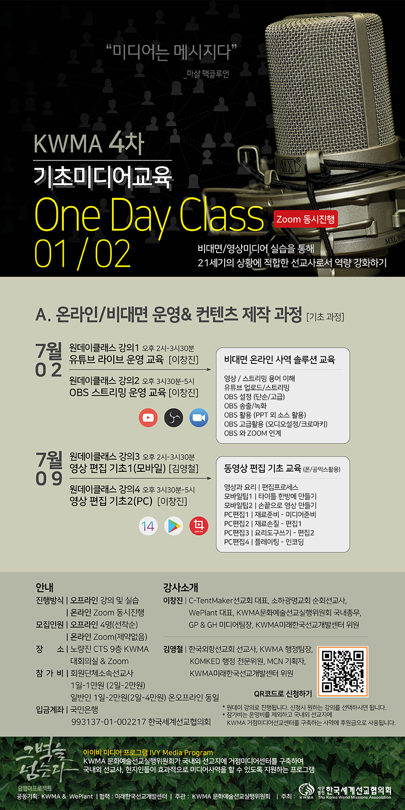3차에 걸쳐 진행되었던 [선교사 기초미디어 교육]이 One Day Class로 확장하여 다양한 강의를 진행합니다.
